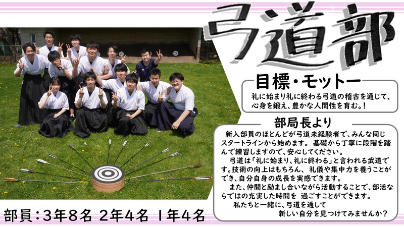 礼に始まり礼に終わる弓道の稽古を通じて、心身を鍛え、豊かな人間性を育む。