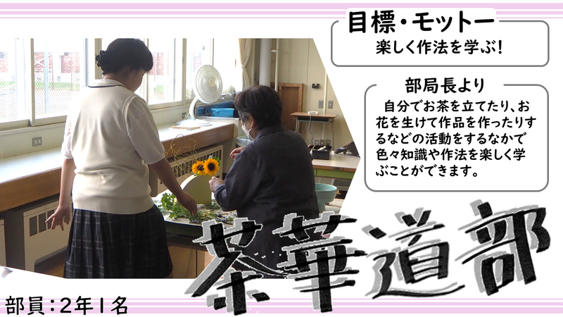 ◆華道:1階の被服教室で、外部講師の先生から、お花の基本の生け方からアレンジまで教わりながら、自分の感性を磨きつつ、季節のお花を生けて、仕上がった作品は職員玄関に飾ります。
